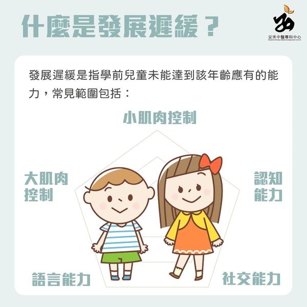 發展遲緩是指學前兒童未能達到該年齡應有的能力,常見範圍包括:大肌肉控制、小肌肉控制、認知能力、語言能力、社交能力。