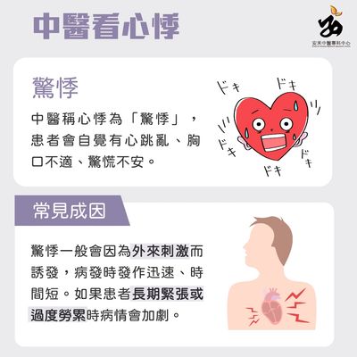 中醫稱心悸為「驚悸」,患者會自覺有心跳亂、胸口不適、驚慌不安。驚悸一般會因為外來刺激而誘發,病發時發作迅速、時間短,如果患者長期緊張或過度勞累時病情會加劇。常見證型有: